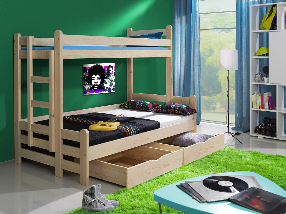 Pokud máte doma dva malé sourozence, které od sebe dělí pár let, ale místa v pokojíku není nazbyt, tak jim pořiďte dětskou patrovou postel Jadisa. Do šuplíků pod spodním lůžkem si dají náhradní lůžkoviny i hračky.