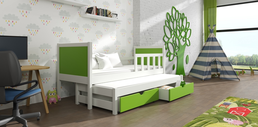 Nechte své ratolesti snít v dětské posteli Evita 28. Vytáhněte přistýlku a uložte prcky vedle sebe. Z prostorných šuplíků si vezměte náhradní lůžkoviny.