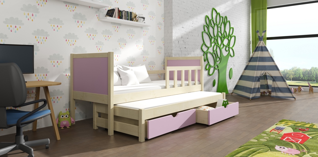 Masiv borovice, levandulové zbarvení čela i úložného prostoru dětské postele Evita 36, se báječně hodí do pokojíku dvou slečen. I v případě, že máte jednu princeznu, tak neváhejte vytáhnout přistýlku, když bude chtít přespat její kamarádka.