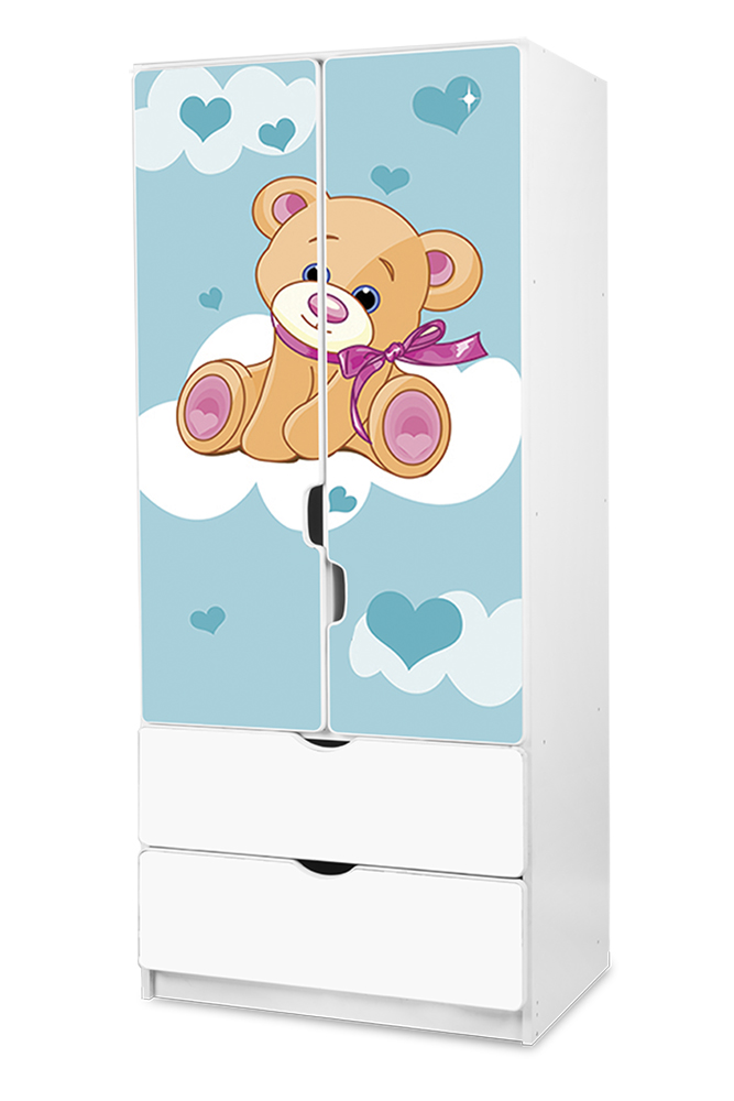 Všude se válí oblečení a máte pocit, že to nebere konce? Udělejte tomu přítrž s dětskou šatní skříní Medvídek 2. Využijte 2 šuplíky, 3 police a šatní tyč.