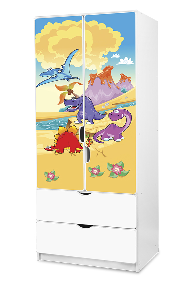 V pokojíčku by neměly chybět veselé barvy. Zpestřete jeho interiér dětskou šatní skříní Ostrov, jejíž motiv s rozesmátými dinosaury si oblíbí kluci i holky. Vy zase oceníte spoustu místa v policích, šuplících a v prostoru se šatní tyčí.