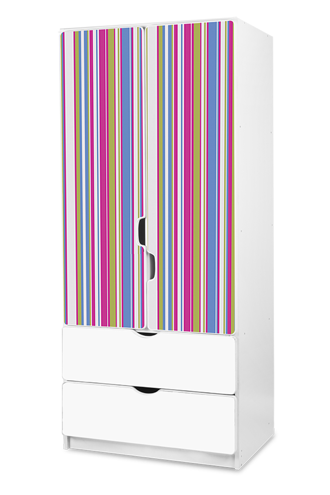 Podpořte interiér dětského pokoje s dětskou šatní skříní Pruhy. Využijte k uložení prádla, oblečení i hraček 2 šuplíky, 3 police a jednu šatní tyč.