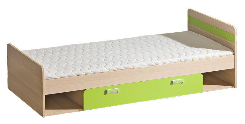 Dětské lůžko s úložným prostorem bude ideální volbou pro předškoláka i odrostlejší dítě. Díky zaobleným hranám se snižuje riziko važnějších úrazů a je tedy vhodné do všech dětských pokojů. Postel Bambi 14 pamatují na všechno a tak na bočních stranách naleznete malé prostory pro odložení přezůvek, tak aby se přes noc neválely po celém pokoji.Postel disponuje úložným šuplíkem ve střední části, který je proveden v pastelové barvě a to buď v zelené nebo fialové. Převážná část postele je v přírodním provedení jasan coimbra, který krásně doplňují výrazné barvy. Síla lamina je 16 – 18 mm a dosáhne tak zatížení kolem 70 kg. V ceně postele je započítán i odpovídající rošt (lamino s nosností 70 kg). Šuplík lze uzpůsobit na vaše přání na pravou či levou stranu až při montáži.