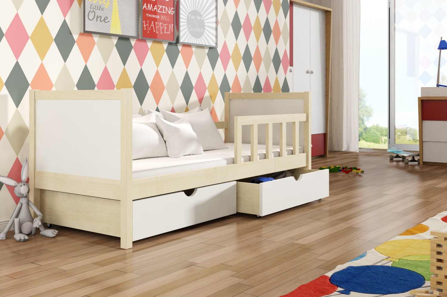 Váš synek nebo dcerka se krásně a hlavně bezpečně vyspí v dětské posteli Evita 16. Zábrana na boku sníží riziko nechtěného pádu na minimum. Úložný prostor v podobě dvou šuplíku pod lůžkem zase snadno pojme spoustu hraček nebo lůžkovin.