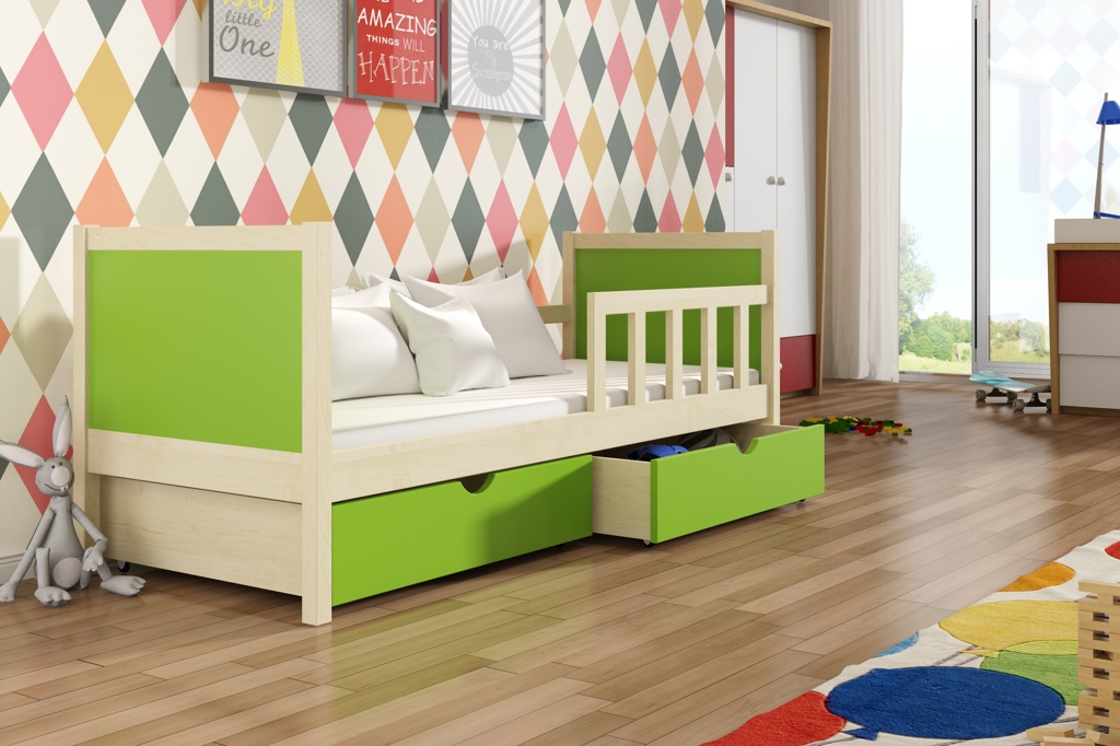 Z dětské postele Evita 20 bude váš prcek ráno vyskakovat plný energie. O příjemnou noc, plnou krásných snů, se postará pohodlná matrace a bezpečnostní zábrana na straně. Do úložného prostoru pod postelí schovejte náhradní peřiny a polštáře.