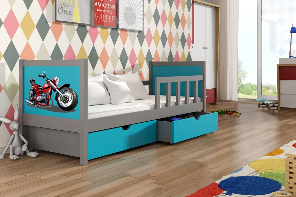 Nechte vašeho školáka odpočívat v pohodlí dětské postele Evita 9. Ráno s úsměvem vstane do školy, odpoledne si pak v pokoji uklidí hračky do praktických šuplíků. Postel je pevná a odolná díky konstrukci z masivu borovice, oceníte i šikovnou zábranu.