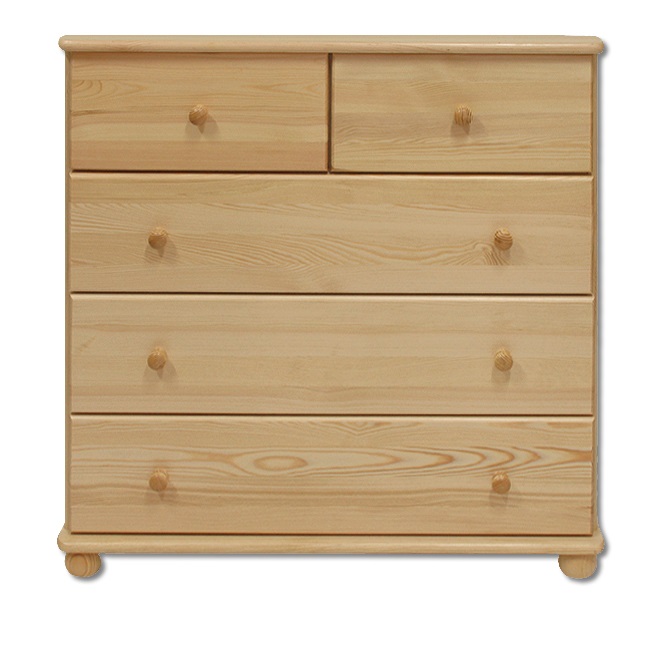 Komoda je vyrobena z pevného masivu borovice, který zaručuje potřebnou stabilitu a dlouhou životnost. Povrch komody je přelakován bezbarvým ochranným lakem, ten zvyšuje odolnost dřeva. K uložení drobností poslouží dva malé horní šuplíky, na větší věci pak využijete tři větší šuplíky pod nimi.