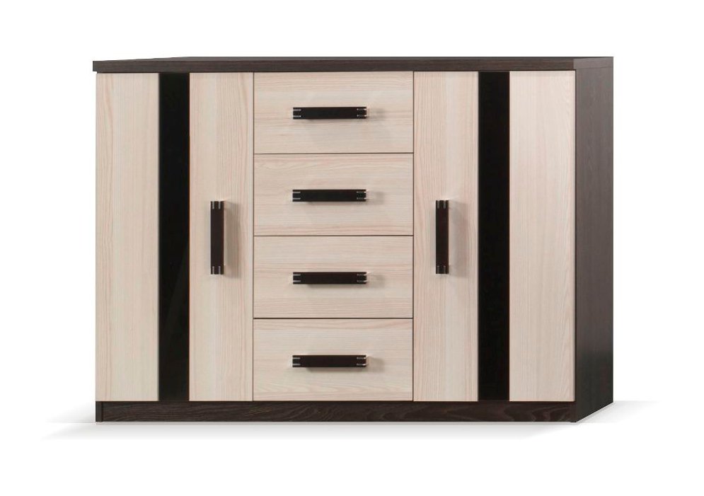 Stylová kombinovaná komoda disponuje čtyřmi šuplíky a dvěma skříňkami po stranách s jednou vloženou policí. Komoda je nabízena ve dvou barevných variantách dle přiloženého vzorníku. Lamino, ze kterého je komoda vyrobena, je nenáročné na údržbu a lehce se omývá.
