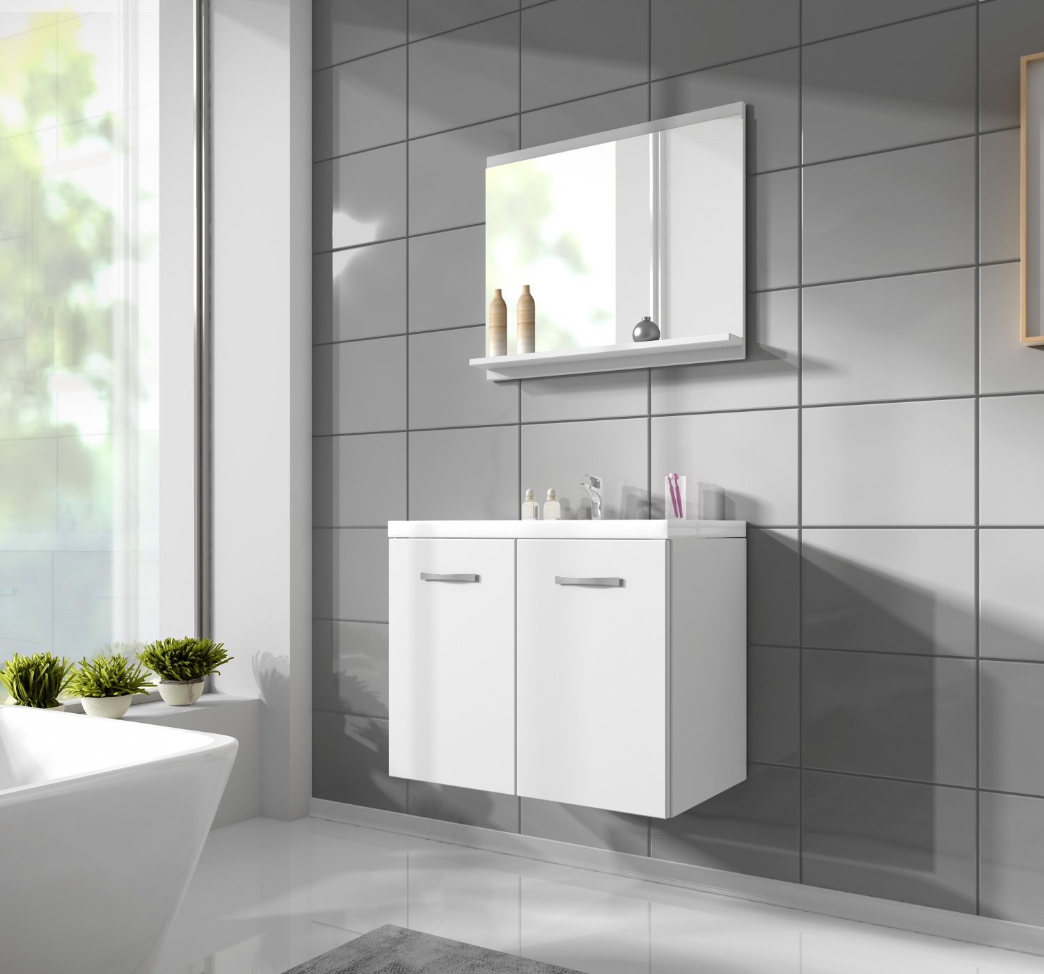 Sestava se skládá z praktického zrcadla s policí a spodní skříňky pod umyvadlo, ke které nabízíme umyvadlo k dokoupení. Oba kusy jsou vyrobeny z proti vlhkosti odolného lamina. Komponenty z této sestavy si navíc můžete vybrat ve třech moderních provedeních. Pro zastánce klasiky v bílé barvě, ve světlém přírodním dekoru san remo nebo v tmavém přírodním dekoru wenge.