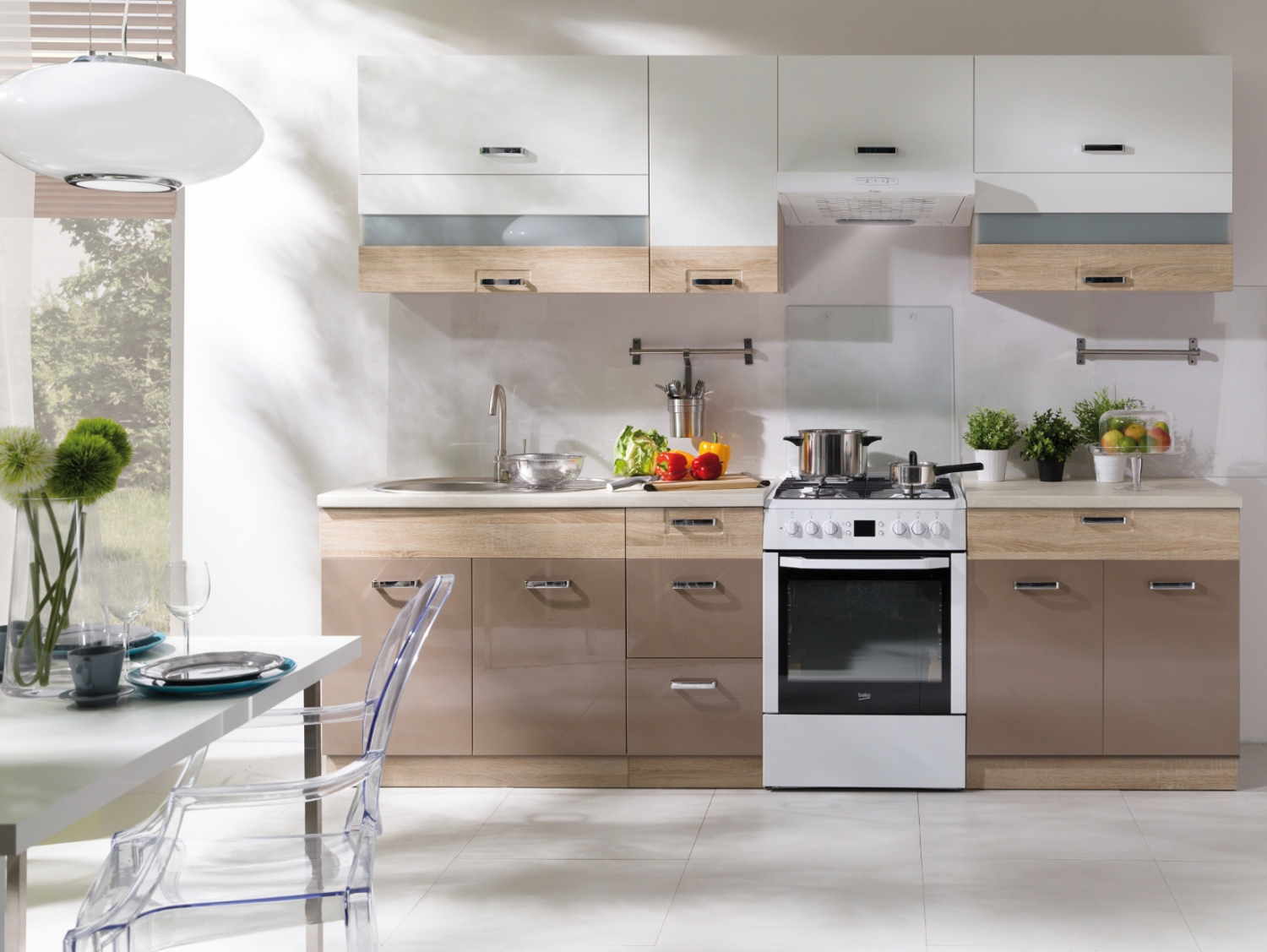 barevné provedení: dub sonoma + bílý lesk + cappuccino lesk + travertin