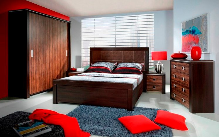 Retro ložnice se skládá ze 2 nočních stolků, šatní skříně s posuvnými dveřmi, šuplíkové komody a komfortní manželské postele s vysokým polstrovaným čelem.