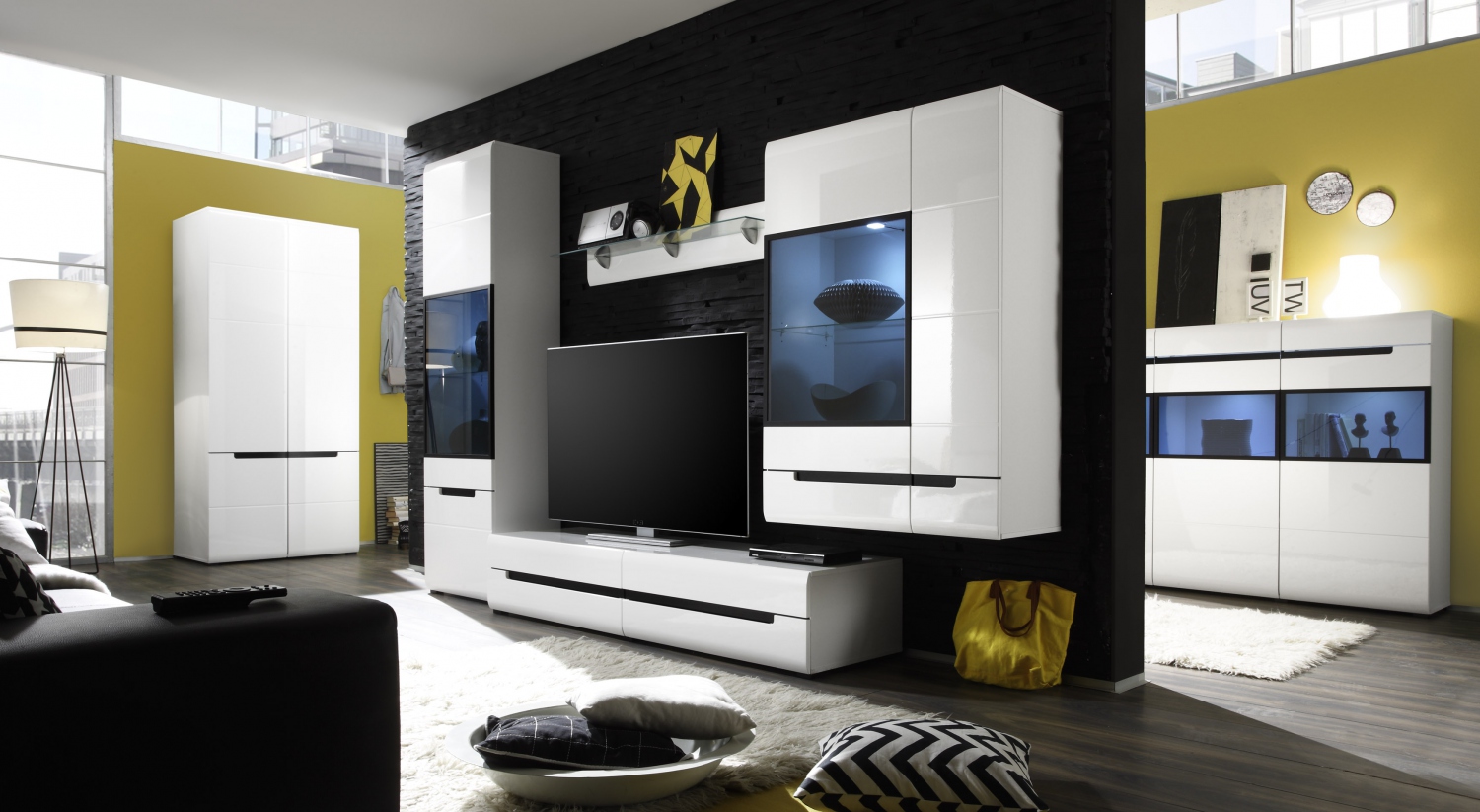 Na výrobu použité kvalitní laminované dřevotřískové desky jsou zárukou odolnosti vůči mechanickému opotřebení, poškození i vlhkosti. Jsou oblíbeny pro svou schopnost zachovat tvarovou i barevnou stálost nábytku. Obývací stěna je vyvedena v nadčasovém dekoru bílé barvy v kombinaci s bílým leskem. Pro větší efekt je možno opatřit veškeré prosklené části netradičním bílým LED osvětlením (modré osvětlení je pouze ilustrativní). Sklo je kouřové.