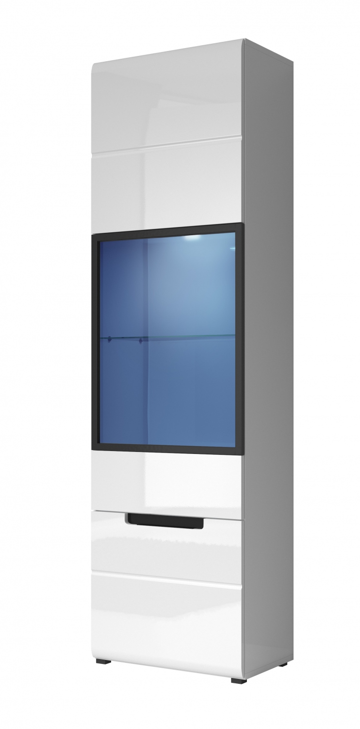 Vnitřní prostor je rozdělen třemi policemi na čtyři samostatné sektory. Prostřední police je na rozdíl od ostatních dvou vyrobena ze skla a je ji možno opatřit stylovým bílým LED osvětlením (modré osvětlení je pouze ilustrativní), které navodí příjemnou a romantickou atmosféru. Sklo je kouřové. Vystavené i uložené předměty chrání dvířka, které dosahují celkové výšky vitríny. Pro lepší manipulaci jsou opatřeny kontrastním širokým madlem.