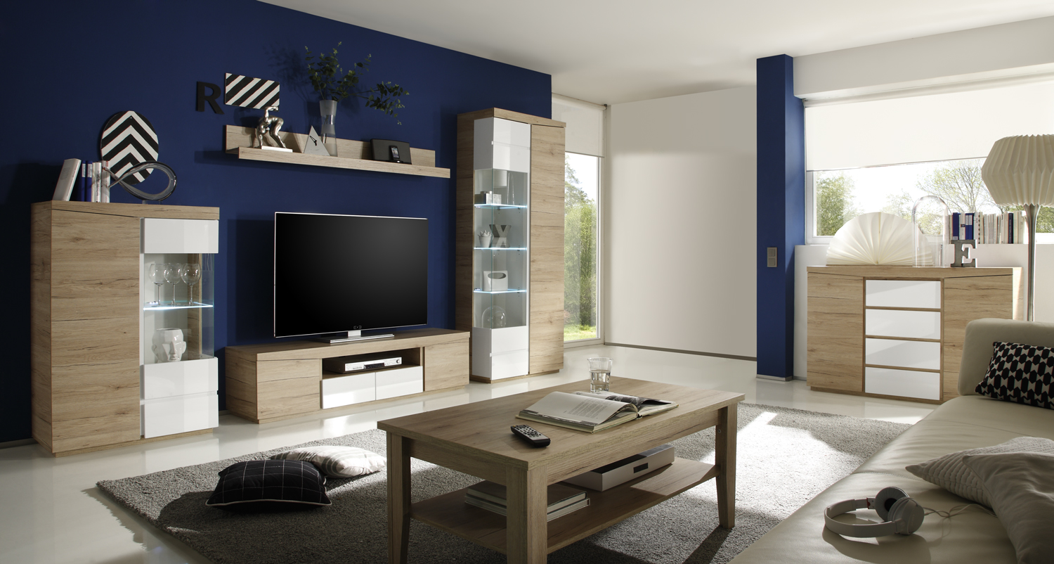 Sestava se skládá z šesti komponentů, které si můžete v interiéru umístit podle své fantazie a prostorových možností nebo se můžete nechat inspirovat naší vyobrazenou sestavou. Nechybí zde konferenční stolek, TV stolek, komoda, police a prosklená komoda s vitrínou. Ke komodě a vitríně je možné dokoupit LED osvětlení prosklených částí, které nechají vyniknout vystavené dekorace. U těchto prosklených částí si také sami zvolíte, zda se budou otvírat doprava či doleva.