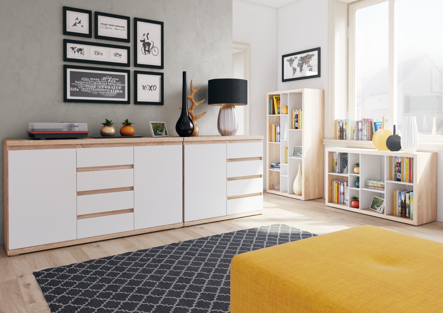 Chcete spoustu úložného prostoru? Kupte si obývací sestavu Bjorn a využijte každý šuplík, skříňku nebo otevřenou přihrádku. Vystavte si dekorace, založte knihy a schovejte cennosti i oblečení.
