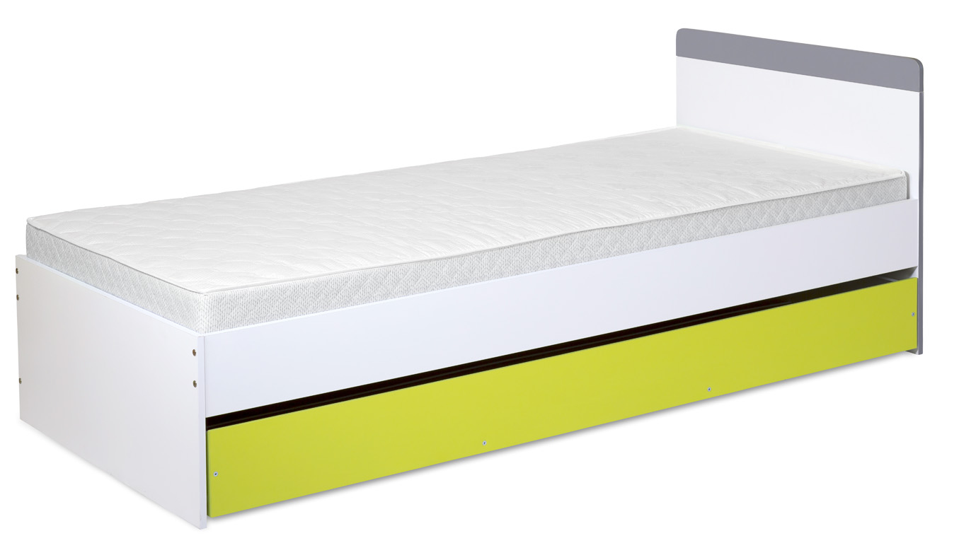Hledáte lůžko na spaní pro dospívající dítě? Prohlédněte si postel Minela, která má všechny náležitosti a uspokojí i náročné zákazníky ohledně designu. Pod postelí je umístěn úložný prostor v podobě šuplíku, jehož čelo je vyvedeno v limetkově žluté barvě. Zadní deska je zvýšená, takže chrání zeď před poškozením a umocňuje pohodlí při sezení.