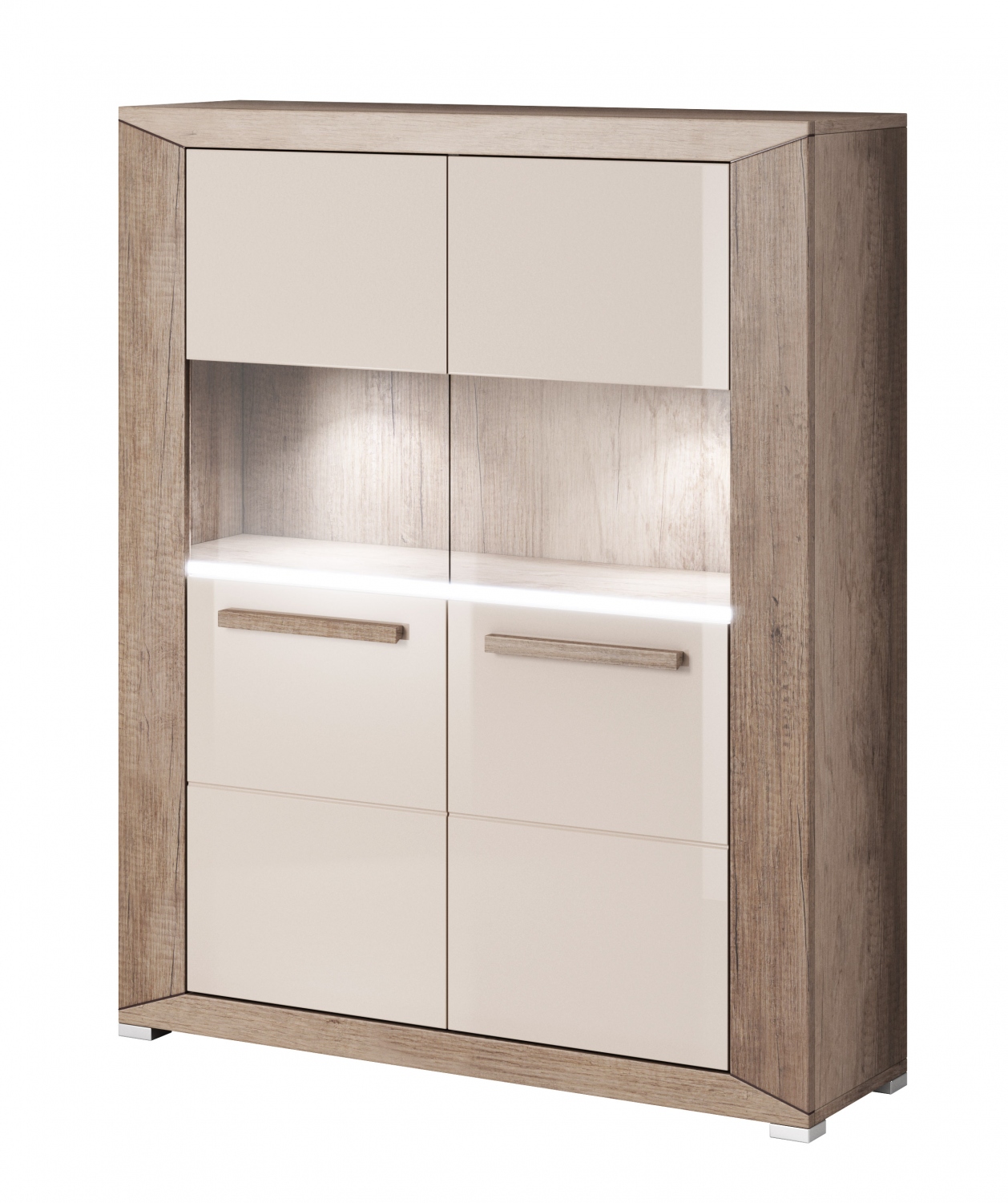 Moderní prosklená komoda Waltaro 3 poslouží jako stylová výstavka i praktický úložný prostor. Moderní design podtrhuje osvětlovací lišta nad úchyty dvířek.