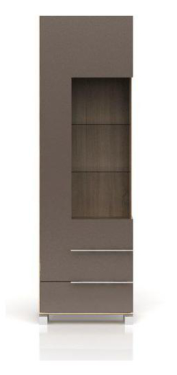 Otevírání dvířek s tichým zavíráním vitríny Nika 2 je levé. Uvnitř se nacházejí 2 skleněné police (jejich součástí je osvětlení) a šuplík s pomalým dojezdem. Nábytek je v barevném provedení dub sonoma + lava.