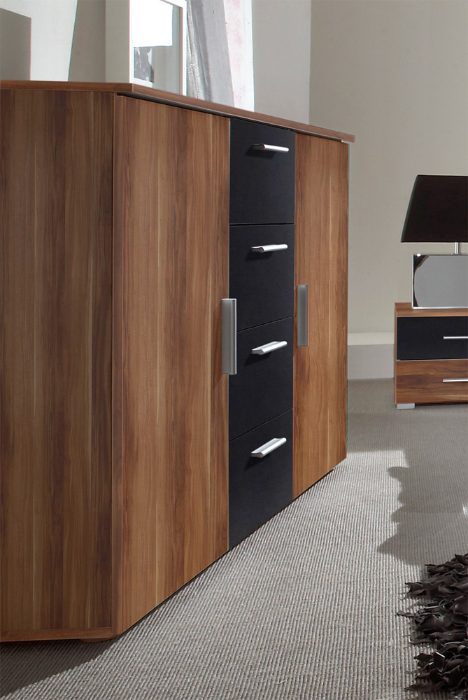 Úložný prostor má podobu 4 výsuvných šuplíků a 2 bočních skříněk a každá skříňka obsahuje jednu vloženou polici. Manipulaci usnadňují podlouhlé úchyty, podtrhující moderní vzhled nábytku. Na výrobu bylo použito pevné a vůči oděru odolné lamino, které oceníte rovněž z hlediska nenáročné povrchové údržby. Pro esteticky sladěný interiér doporučujeme kombinování s ostatními komponenty nábytkové kolekce Veria, která nabízí také další varianty barevného provedení.
