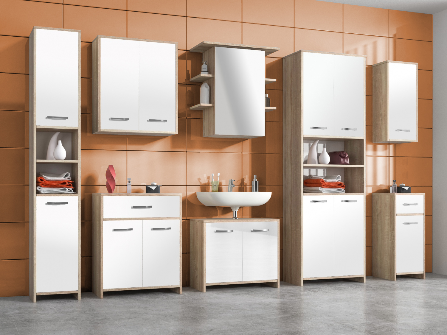 Pro velké koupelny tu máme skvělou nabídku v podobě koupelnové sestavy Arion 1. Sestava obsahuje osm různorodých skříněk ve dvoubarevném provedení.