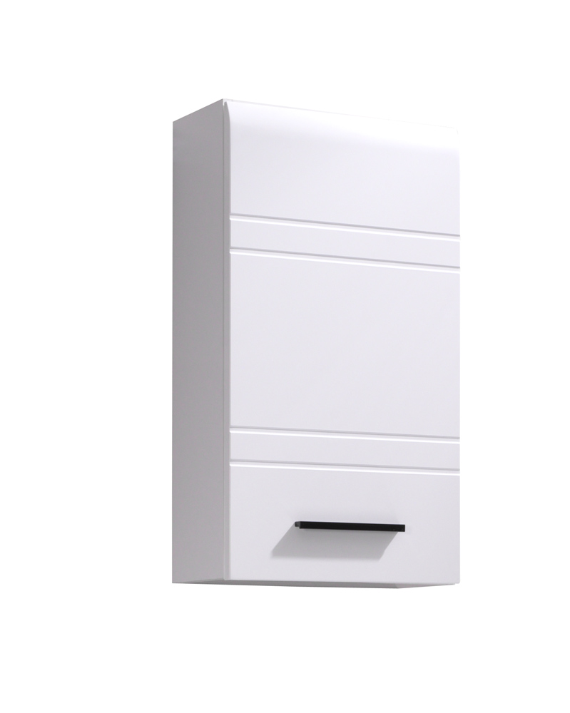 Zavěšením nábytku na zeď získáte více prostoru, který můžete využít jiným způsobem. Bílá skříňka s černou úchytkou z PVC uvnitř obsahuje policový systém, jenž pojme velké množství kosmetiky. Dvířka jsou na horní straně zbroušena a zaoblená hrana zjemňuje celkový vzhled.